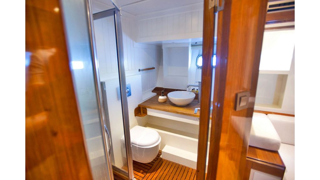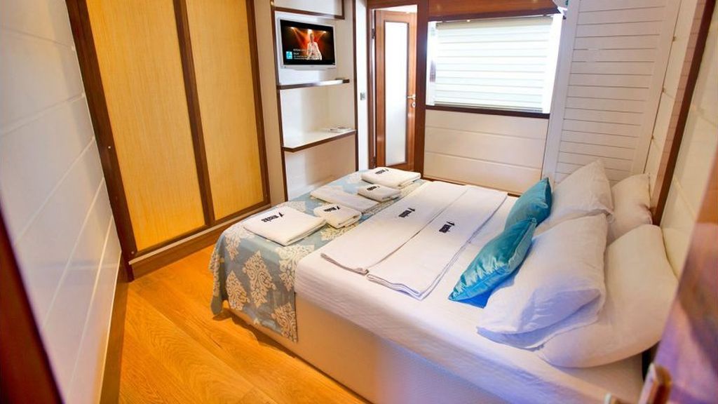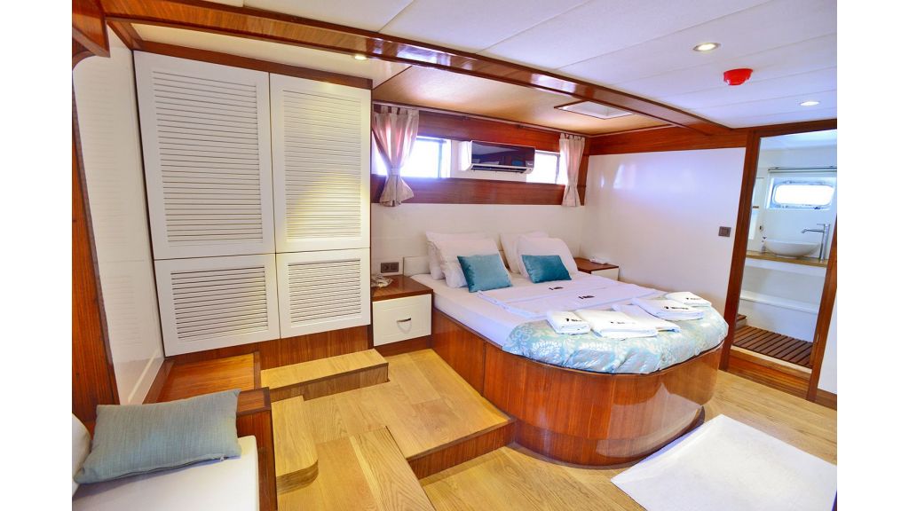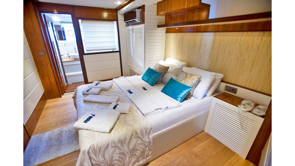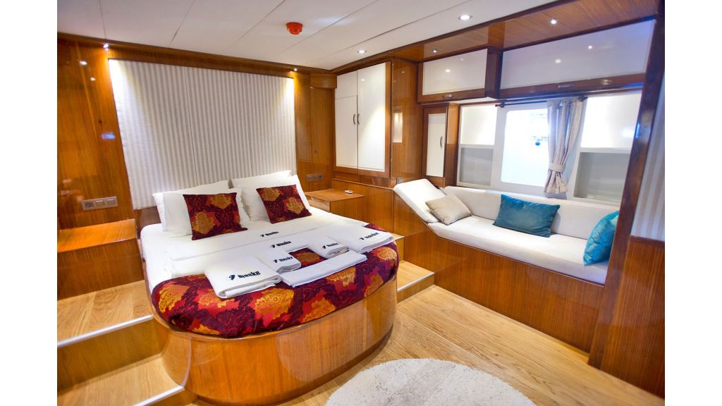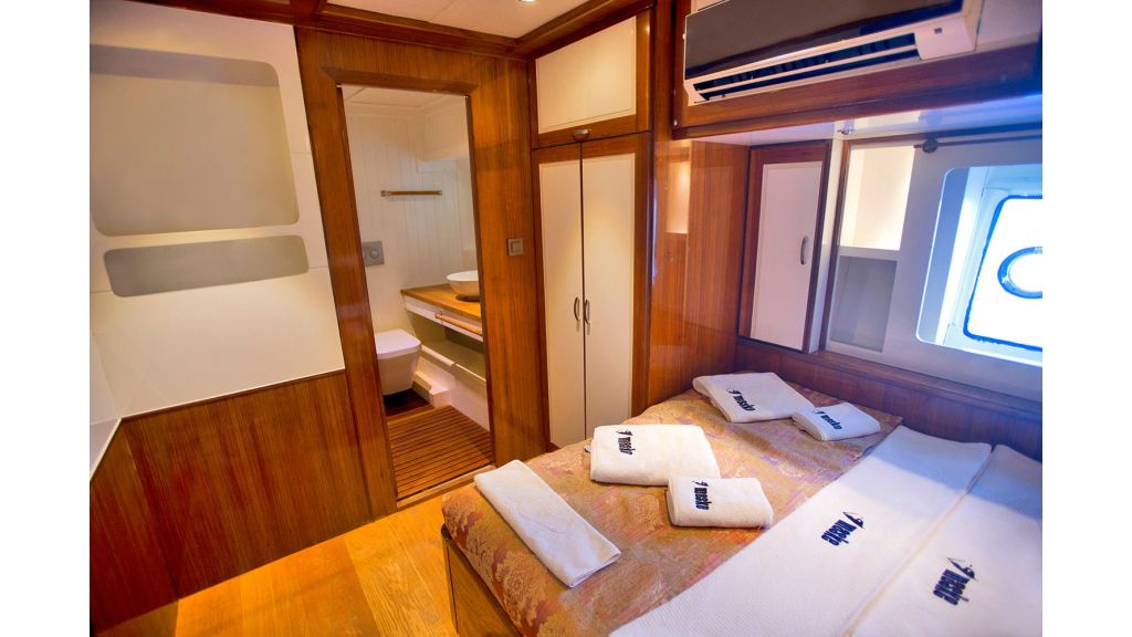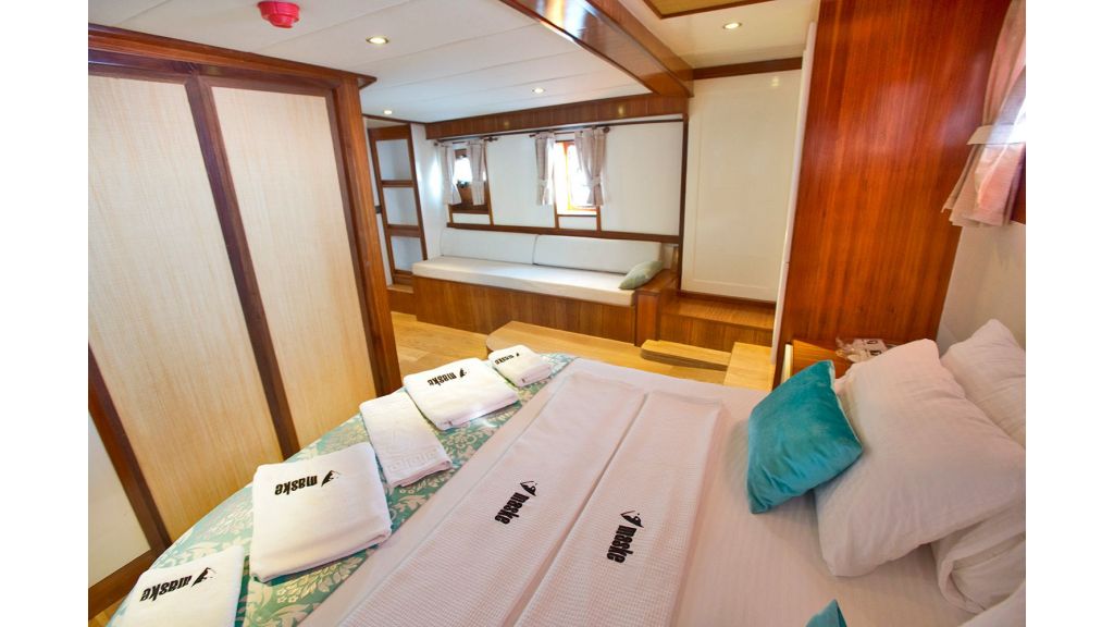 | Die Gulet Maske 2 ist eine 30 Meter lange Luxusyacht, gebaut 2013. Sie verfügt über sechs Kabinen – zwei Master-, drei Doppel- und eine Zweibettkabine – und bietet Platz für bis zu zwölf Gäste. Jede Kabine wurde sorgfältig gestaltet und verfügt über ein eigenes Bad. Das Deck bietet große Ess- und Loungebereiche, gepolsterte Sitze und weitläufige Sonnenflächen. Der Salon ist elegant eingerichtet und umfasst Ess- sowie Küchenbereiche. Zur Wassersportausstattung gehören ein 100 PS Beiboot, ein Stand-up-Paddleboard, Wasserski, Ringo, Kanu, Schnorchel- und Angelausrüstung. Angetrieben wird sie von zwei 360 PS Iveco-Motoren und zwei 27 kVA Generatoren, mit einer Reisegeschwindigkeit von 11 Knoten. Klimaanlage: 18 Stunden täglich. Die Maske 2 ist die ideale Wahl für Gäste, die Luxus, Komfort und Aktivität auf ihrer Blauen Reise kombinieren möchten. |