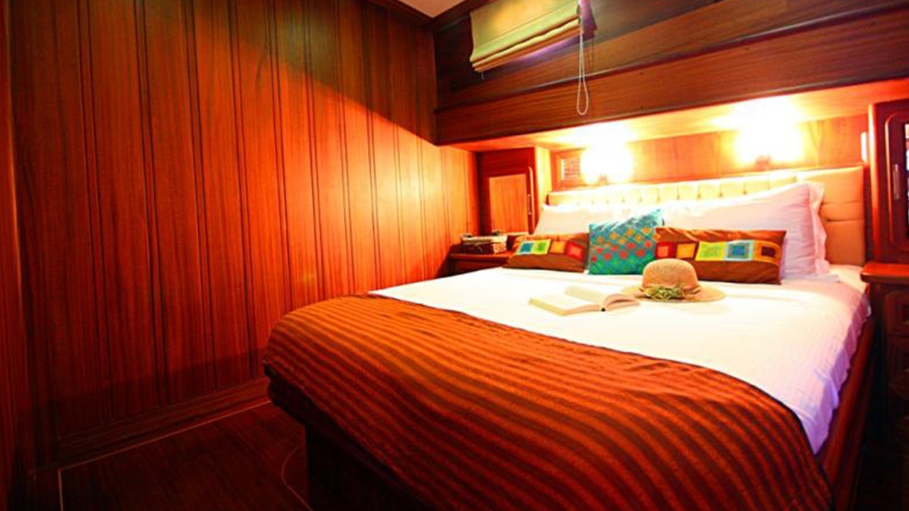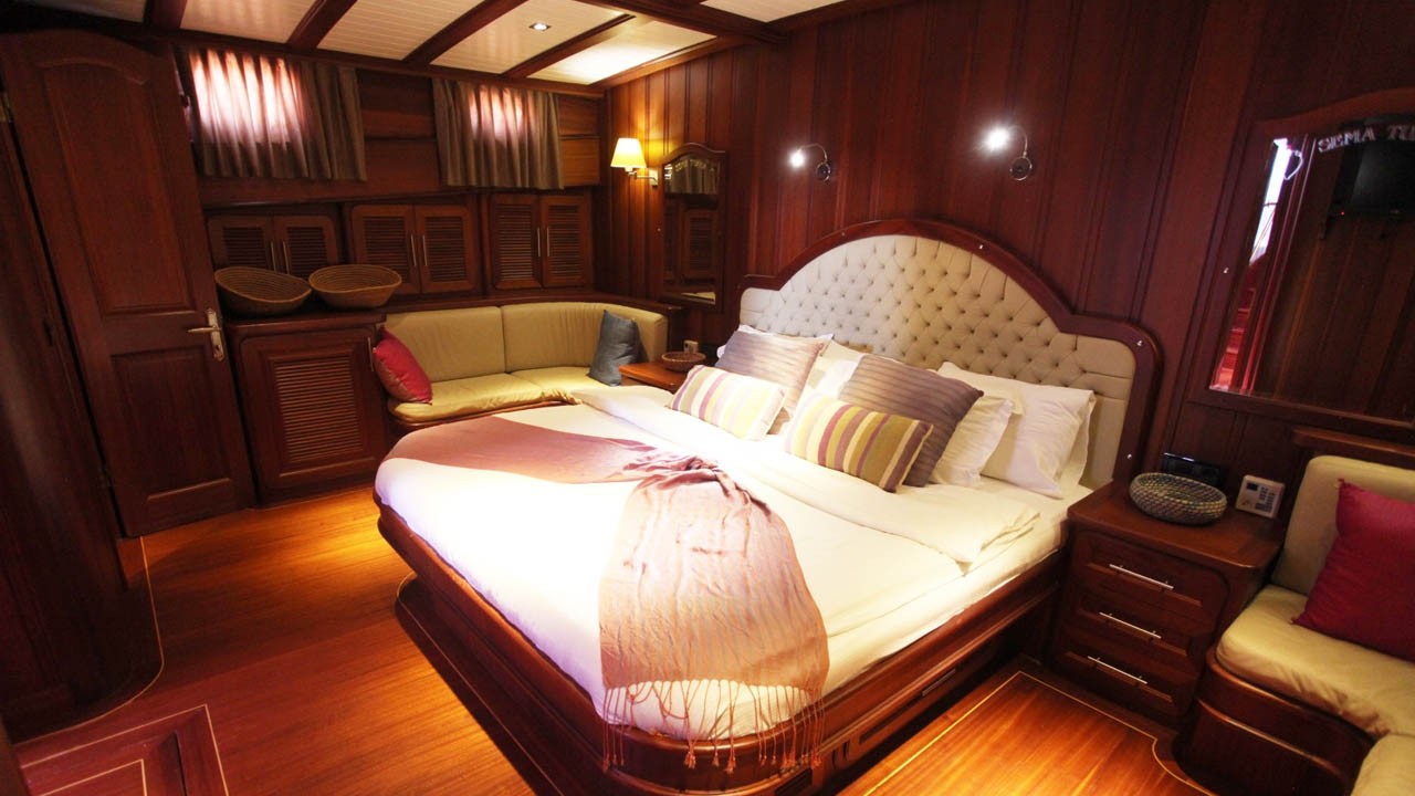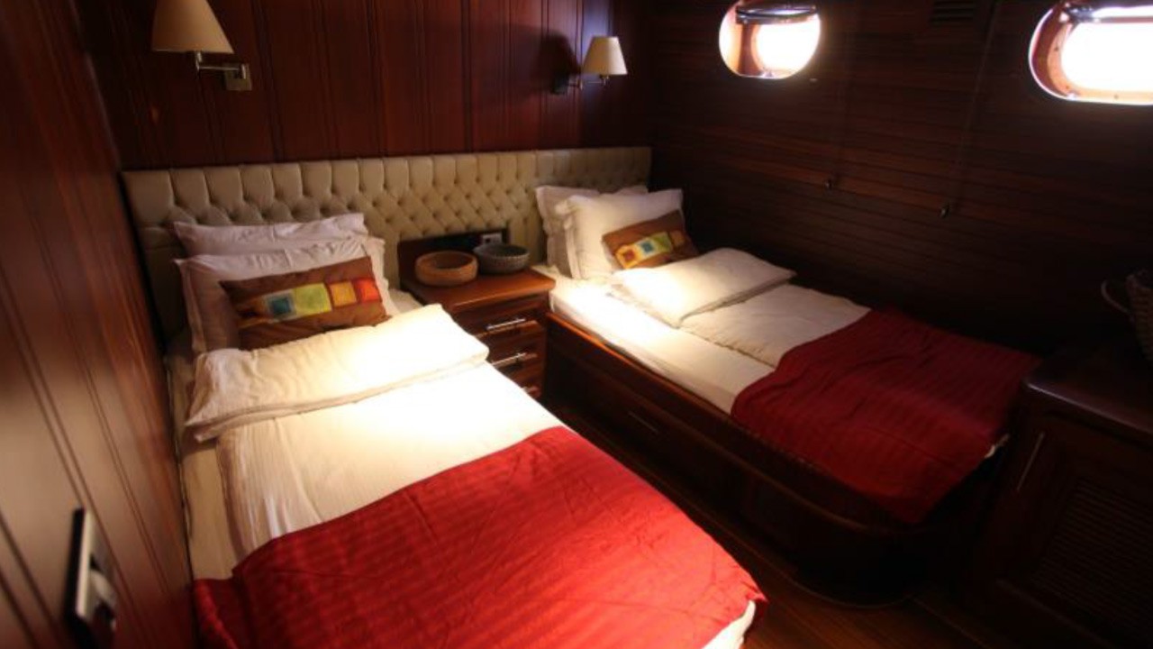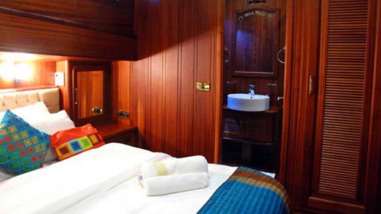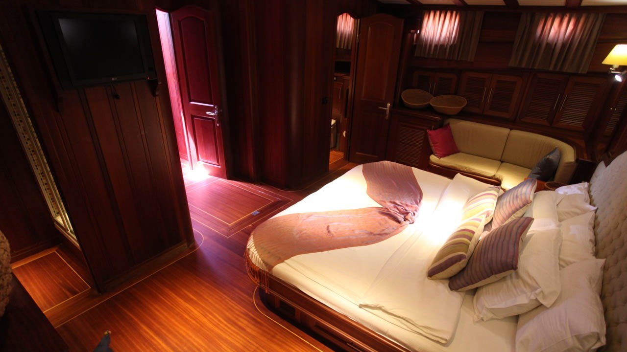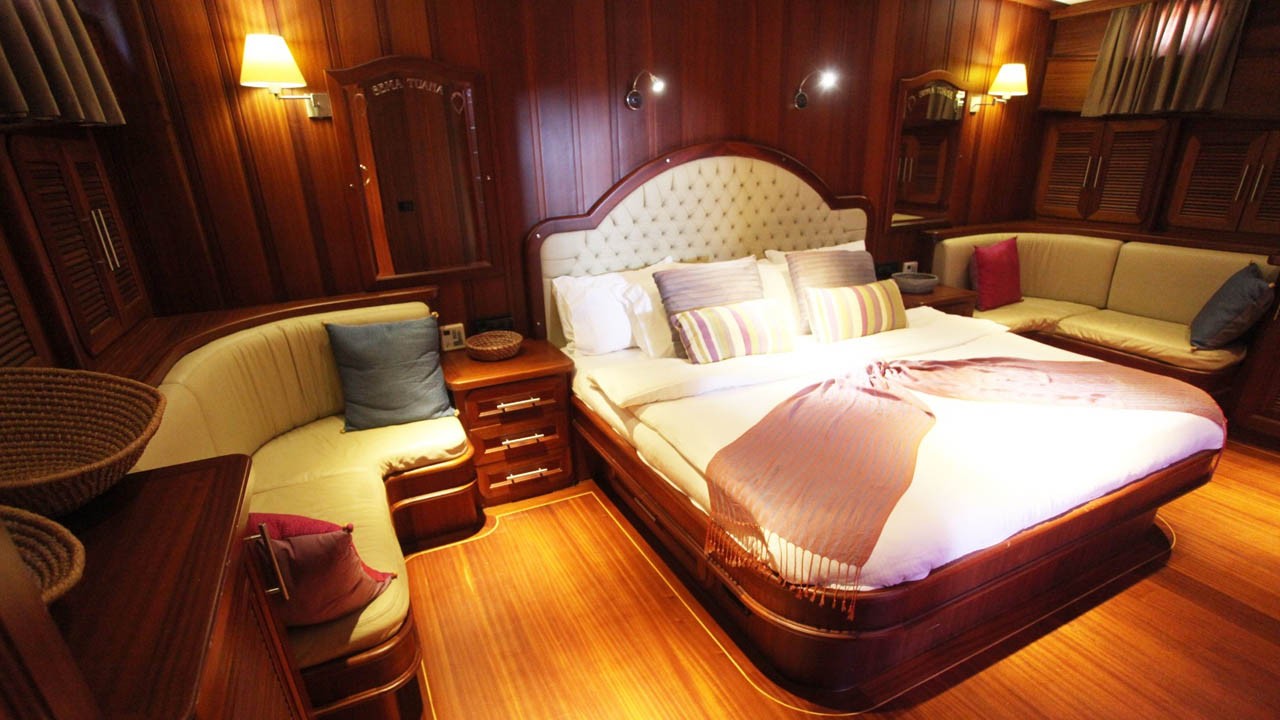 6 Kabinen, bestehend aus: 2 Masterkabinen mit Queensize-Doppelbett, 2 Doppelkabinen und 2 Kabinen mit je zwei Einzelbetten. Maximal 12 Gäste. Alle Kabinen verfügen über ein eigenes Bad mit Massagedusche, individuell regulierbare Klimaanlage mit Fernbedienung und Toiletten mit Push-Flush-Spülung. Separate Crew-Kabinen. |