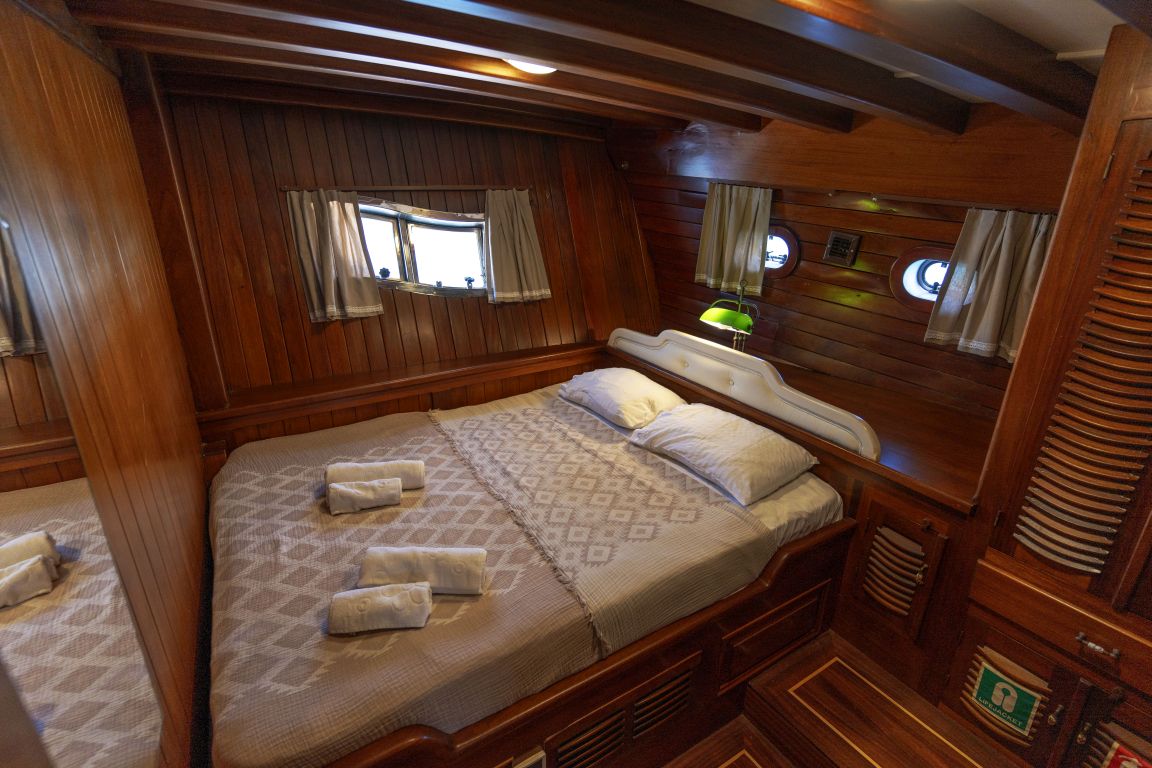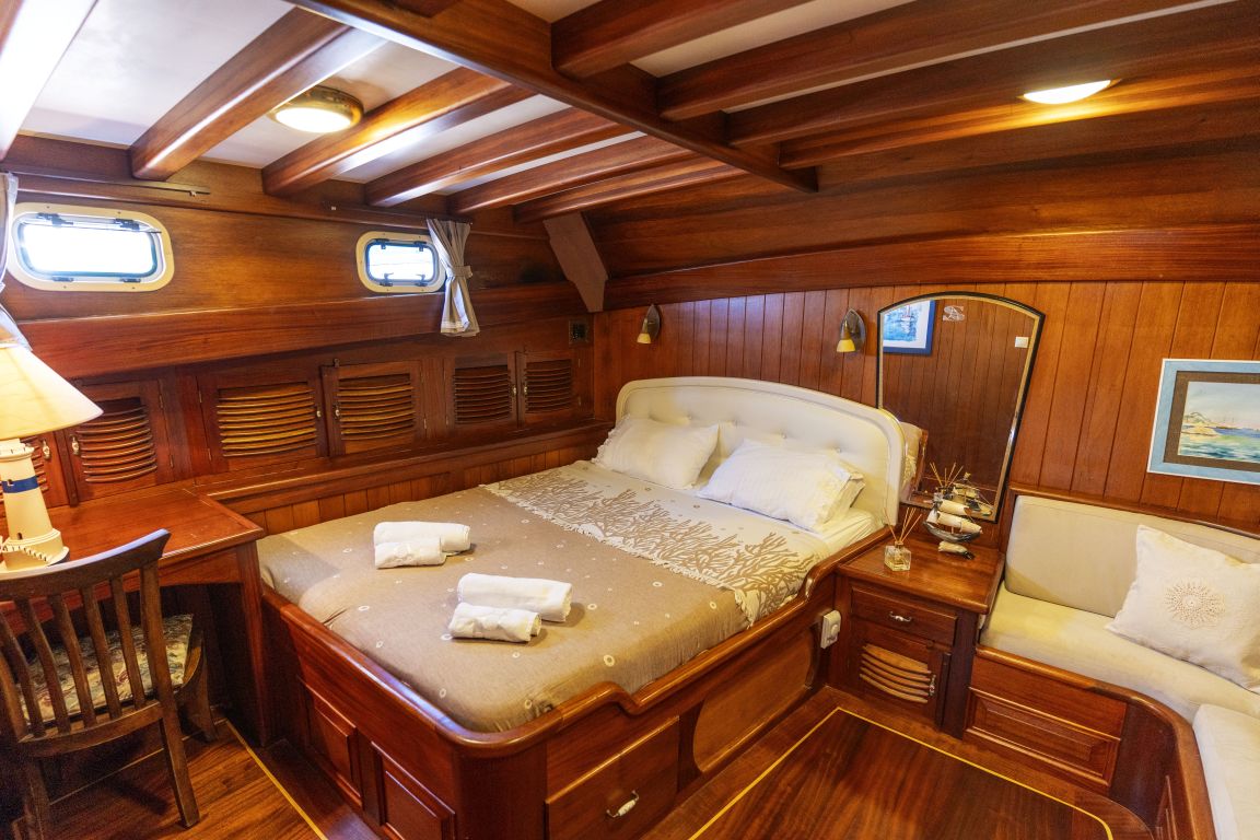 Kapazität für bis zu 12 Gäste; 1 Master, 2 Doppel, 2 Zweibett und 1 Dreibettkabine, Duschkabine und Toiletten in allen Kabinen, separate Mannschaftskabinen. |