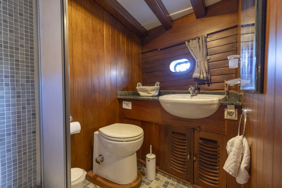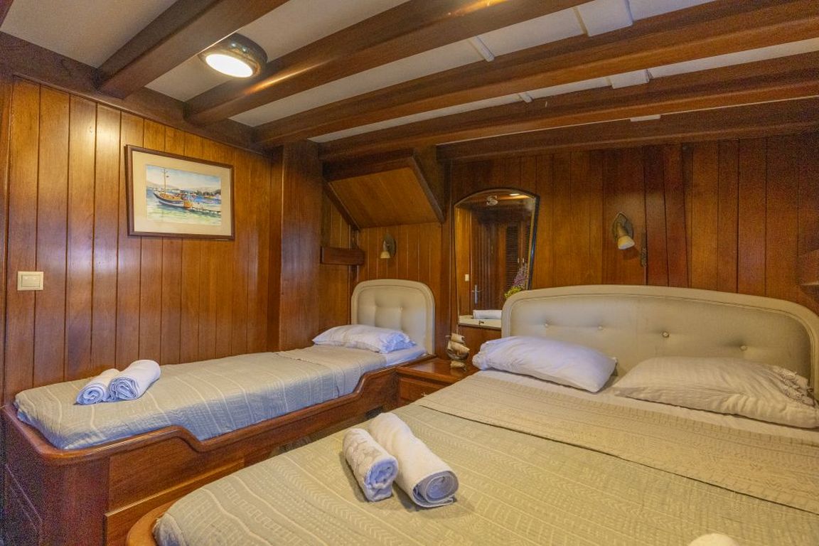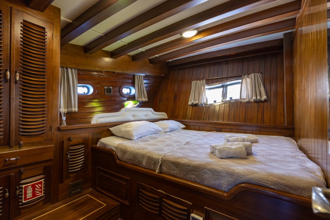 | Die Gulet Serenad ist eine geräumige, 29 Meter lange Yacht, gebaut 2003 und 2013 renoviert. Sie verfügt über sechs Kabinen – eine Master-, zwei Doppel-, eine Dreibett- und zwei Zweibettkabinen – mit Platz für bis zu zwölf Gäste. Jede Kabine ist mit eigenem Bad ausgestattet. Das Deck bietet großzügige Essbereiche, gepolsterte Sitzflächen und weitläufige Sonnenzonen. Im Salon befinden sich ein Essbereich und eine gut ausgestattete Kombüse. Für Wassersport bietet die Serenad ein 70 PS Beiboot, Stand-up-Paddleboards, Kanus, Schnorchel- und Angelausrüstung. Angetrieben von einem 450 PS Iveco-Motor und 22 + 22,5 kVA Generatoren, erreicht sie 10 Knoten. Klimaanlage: 8 Stunden täglich. Die Serenad ist ideal für Familien und Gruppen, die eine komfortable und abenteuerliche Reise entlang der türkischen Küste unternehmen möchten. |
