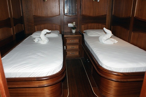 | Bis zu 12 Gästekapazität; 2 Master, 3 Doppel, 1 Zweibettkabine, Klimaanlage, Duschkabine und Toiletten im Haushaltsstil in allen Kabinen, separate Mannschaftskabinen. |