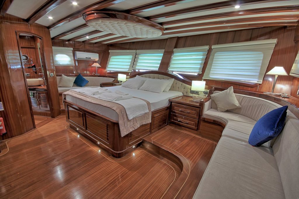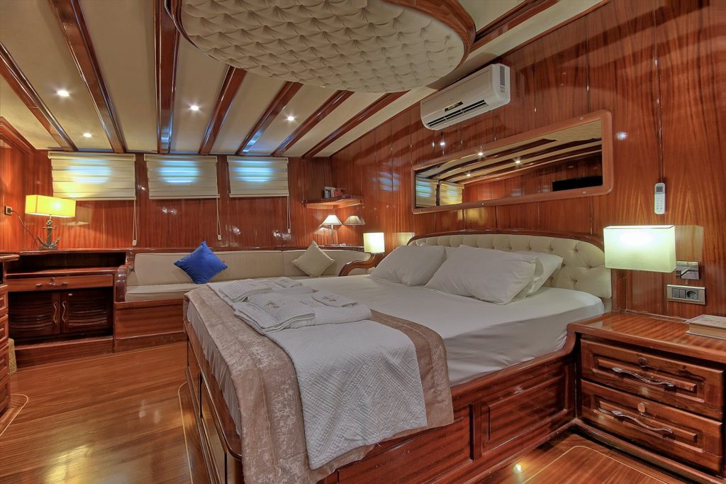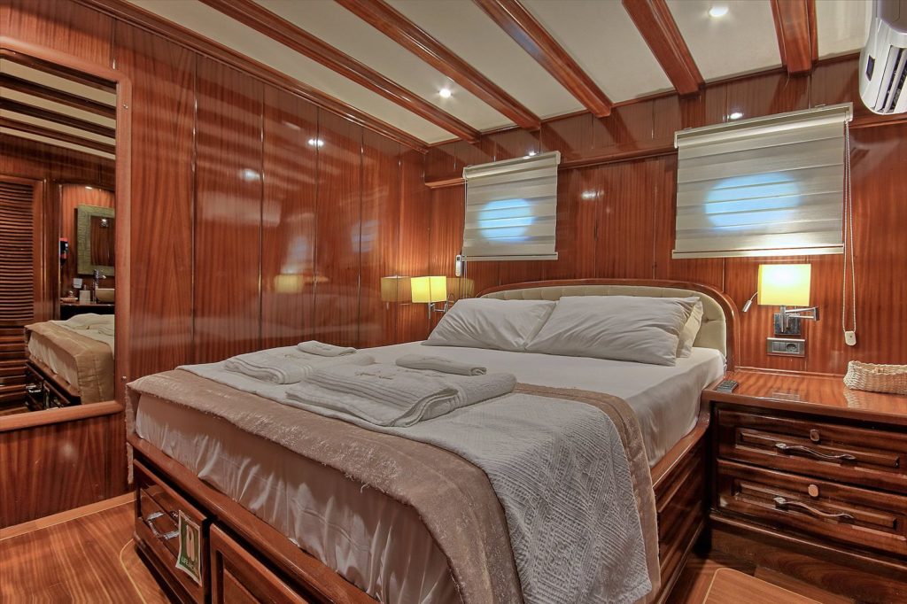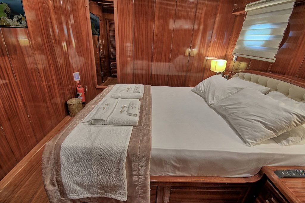 Unser Gulet mit 8 Kabinen hat 1 VIP-, 1 Master-, 4 Doppel- und 2 Dreibettkabinen, mit Klimaanlage, Toilette und Dusche in jeder Kabine, und kann problemlos insgesamt 16 Gäste beherbergen. Das große und komfortable Wohnzimmer ist mit Geräten wie Fernseher, Satellitenfernsehen und CD-Player ausgestattet, um Ihre Zeit außerhalb des Meeres noch angenehmer zu gestalten. Während Sie die in unserer voll ausgestatteten Küche zubereiteten Mahlzeiten genießen, können Sie auch jeden Blauton entdecken.