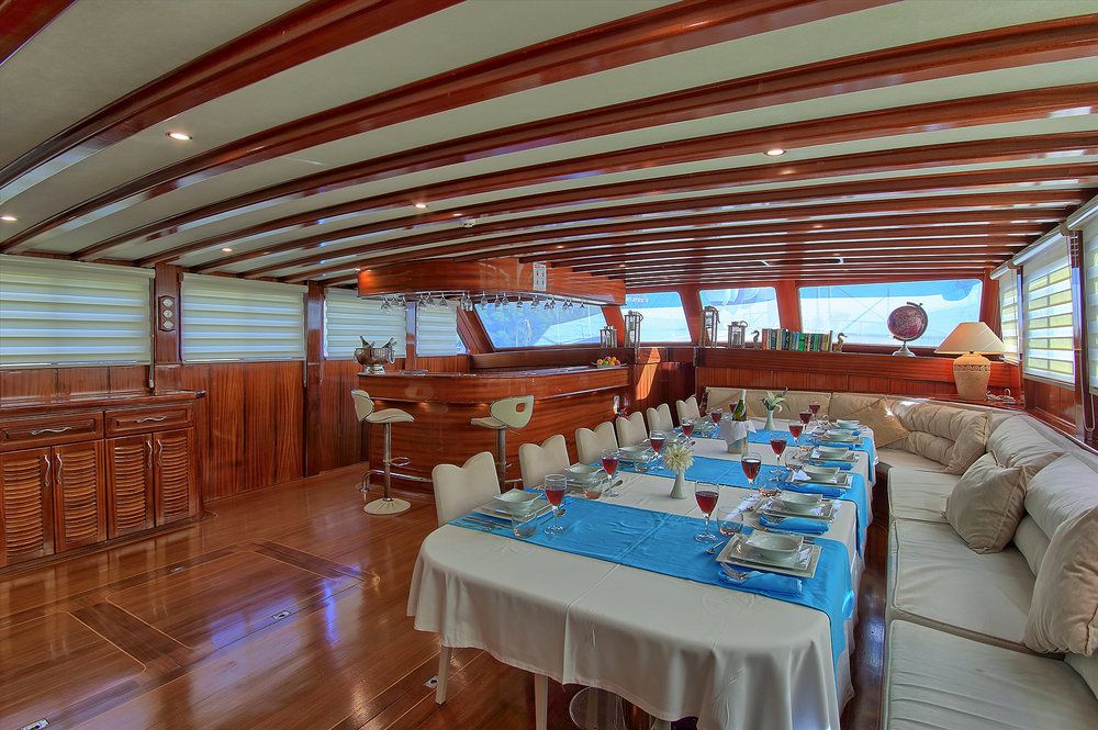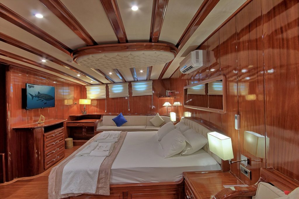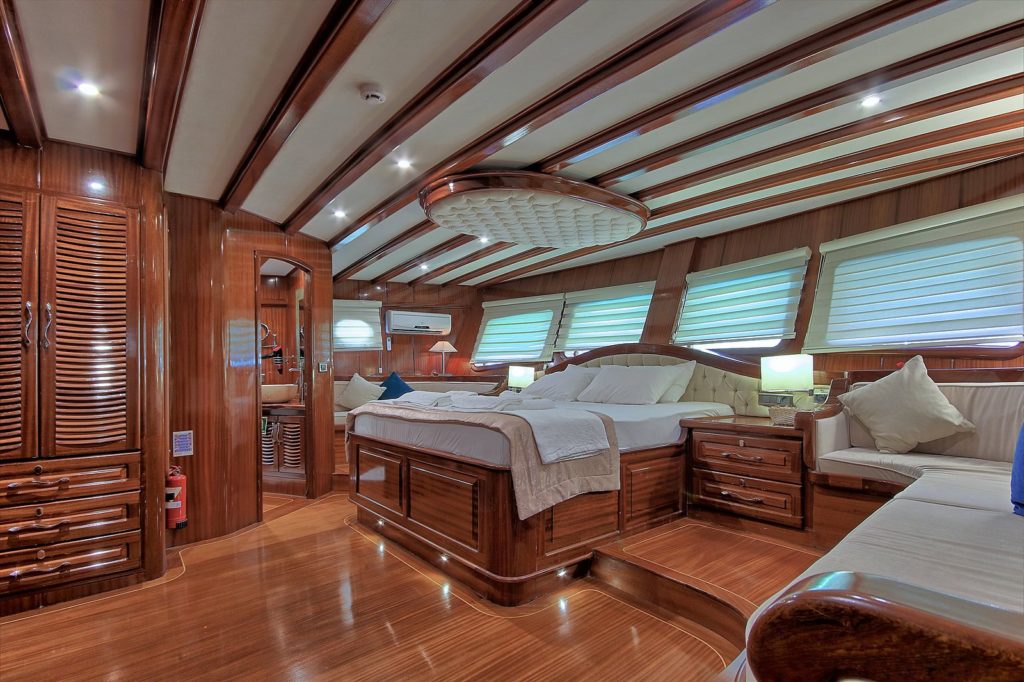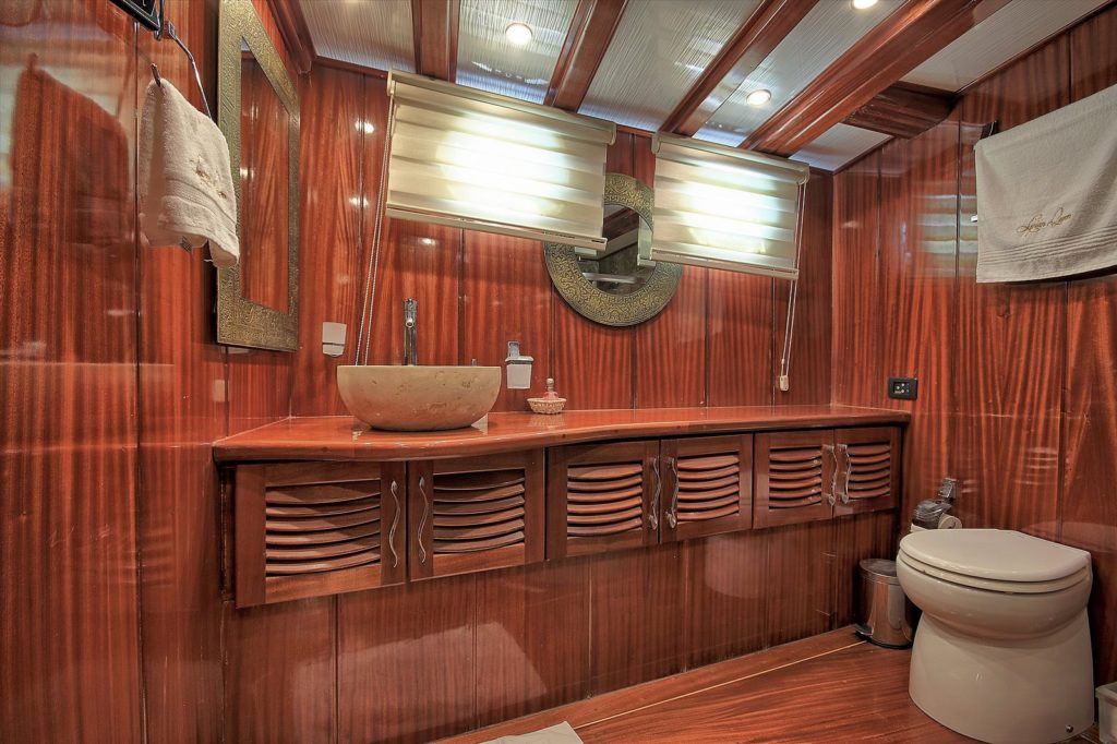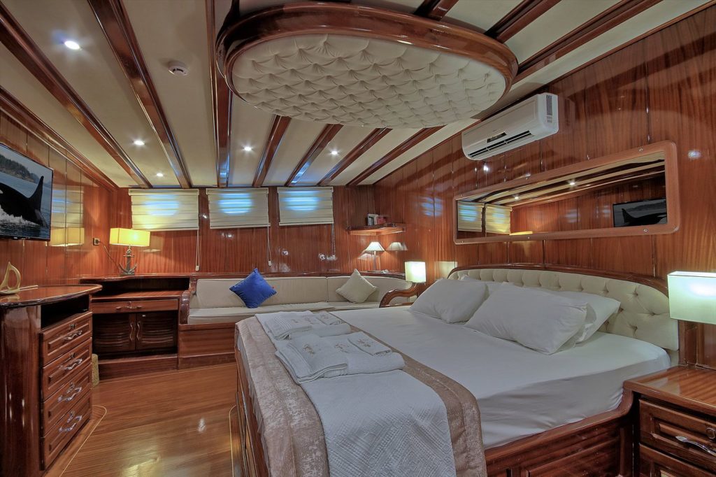 Unser Gulet mit 8 Kabinen hat 1 VIP-, 1 Master-, 4 Doppel- und 2 Dreibettkabinen, mit Klimaanlage, Toilette und Dusche in jeder Kabine, und kann problemlos insgesamt 16 Gäste beherbergen. Das große und komfortable Wohnzimmer ist mit Geräten wie Fernseher, Satellitenfernsehen und CD-Player ausgestattet, um Ihre Zeit außerhalb des Meeres noch angenehmer zu gestalten. Während Sie die in unserer voll ausgestatteten Küche zubereiteten Mahlzeiten genießen, können Sie auch jeden Blauton entdecken.