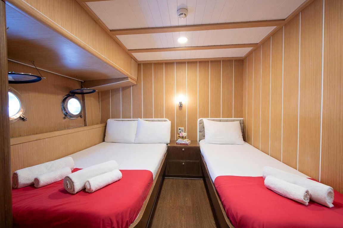 | Die Gulet Oguzbey ist 32 Meter lang, gebaut 1993 und 2021 renoviert. Sie verfügt über acht Kabinen – zwei Master-, zwei Doppel- und vier Dreibettkabinen – und bietet Platz für bis zu 22 Gäste. Jede Kabine ist klimatisiert, mit eigenem Bad; Klimaanlage 18 Stunden täglich. Mit einer Breite von 7,3 Metern bietet sie große Außenbereiche mit Essplätzen, gepolsterten Sitzen und Sonnenzonen. Der Salon ist komfortabel mit Essbereich und Kombüse gestaltet. Zur Wassersportausstattung gehören ein 115 PS Beiboot, SUP-Board, Wasserski, Wakeboard, Ringo, Banane, Kanu, Schnorchel- und Angelausrüstung. Angetrieben von zwei 450 PS Baudouin-Motoren und zwei 27 kVA Generatoren, erreicht sie 11 Knoten. Die Oguzbey ist ideal für große Gruppen, die sowohl Komfort als auch Abenteuer suchen |