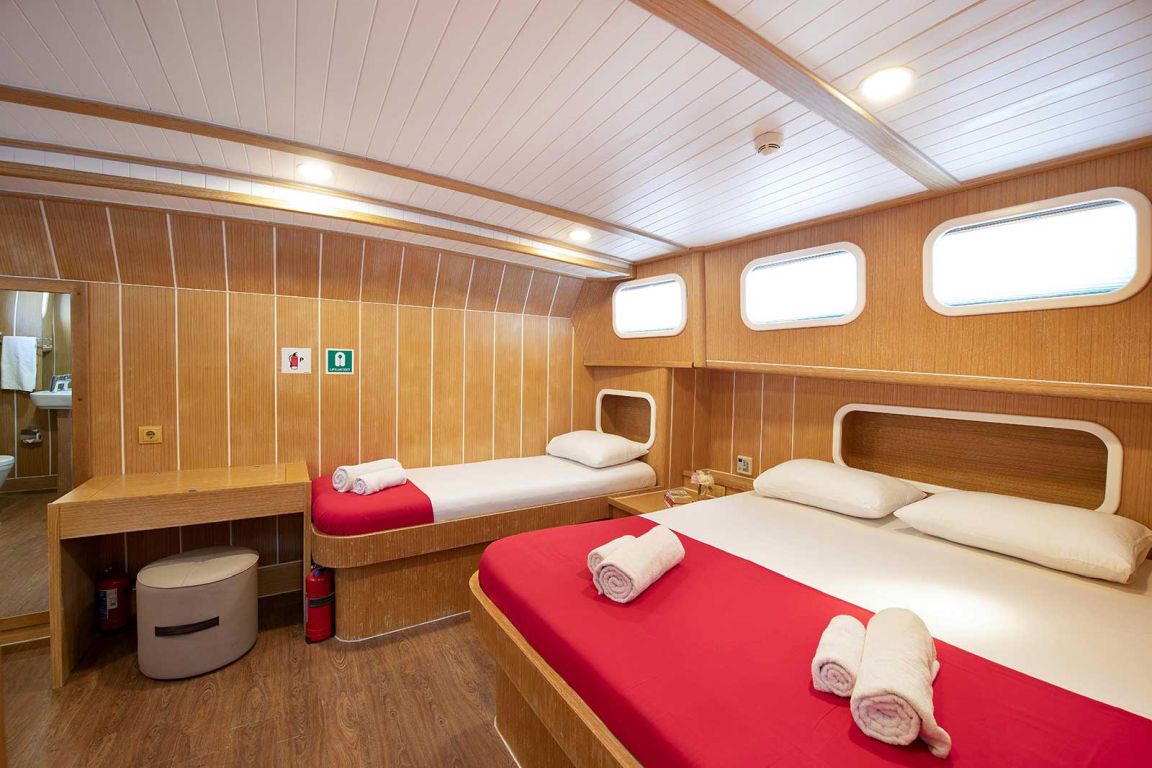 8 Kabinen für 16 Gäste: 2 Master-Suiten mit zusätzlichem Einzelbett, 4 Doppelzimmer mit zusätzlichem Einzelbett, 2 Doppelzimmer, Klimaanlage, Duschkabine und Toiletten im Haushaltsstil in allen Kabinen, separate Mannschaftskabinen. 24 Stunden Klimaanlage |