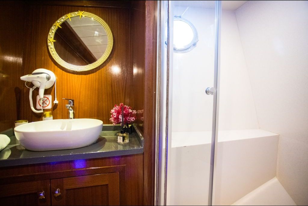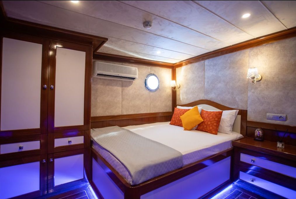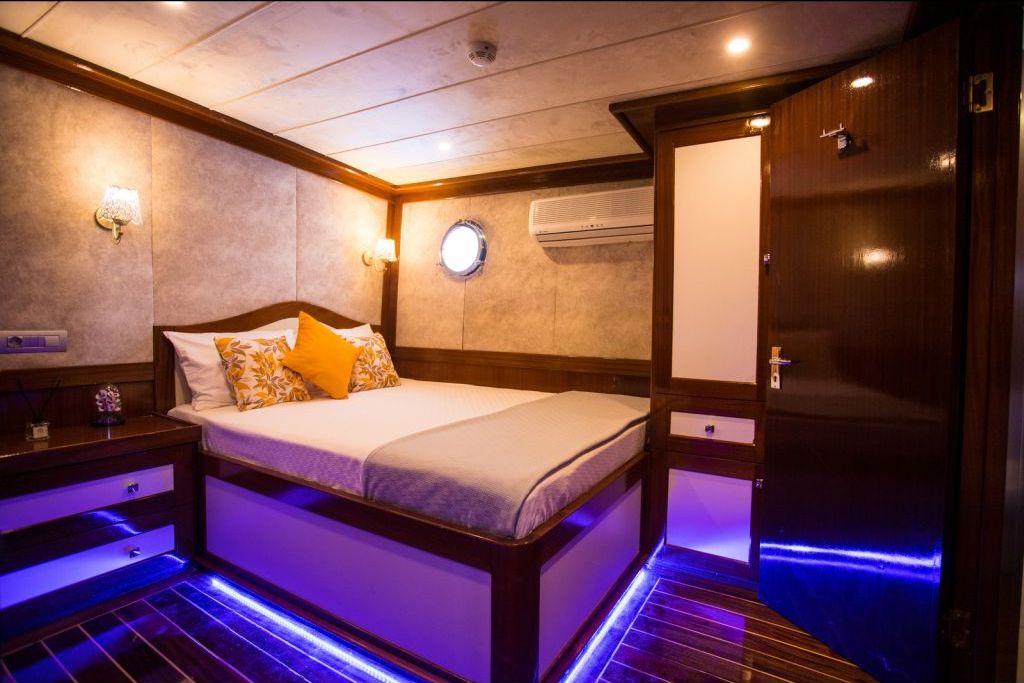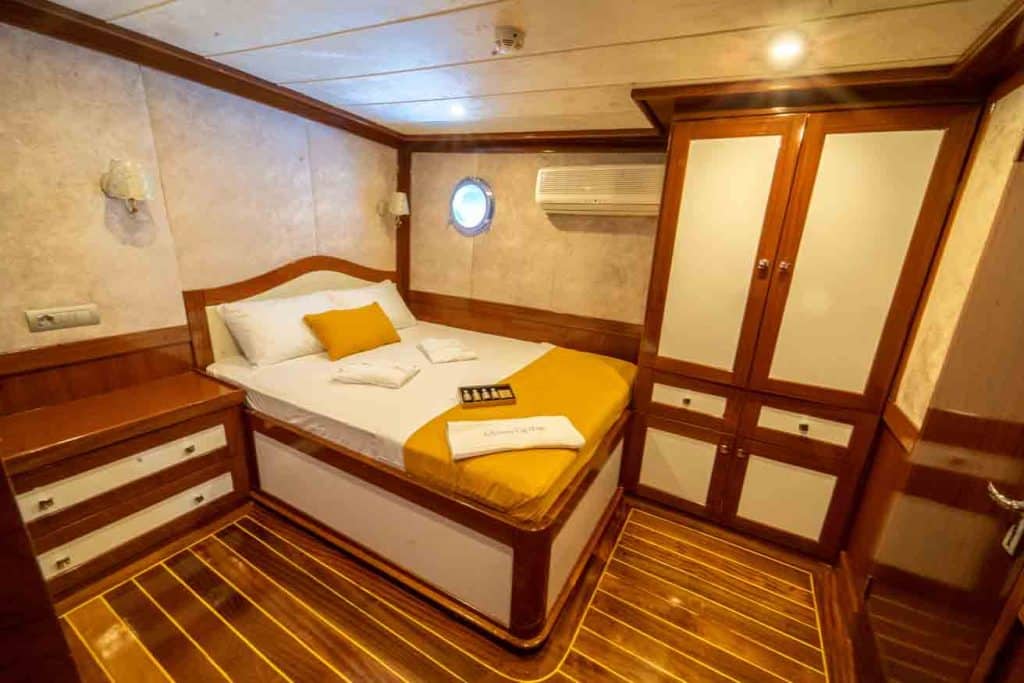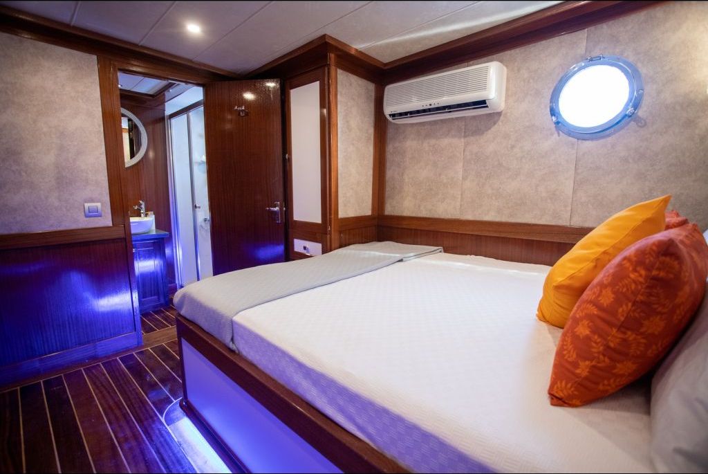 Bis zu 18 Gäste; 6 Doppelkabinen + 2 Dreibettkabinen, Klimaanlage, Kleiderschrank, Duschkabine und Toiletten im Haushaltsstil in allen Kabinen, separate Mannschaftskabinen. |