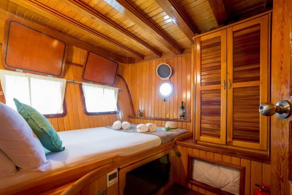 Bis zu 16 Gäste; 6 Doppelkabinen, 2 Zweibettkabinen, Klimaanlage, Kleiderschrank, Duschkabine und Toiletten im Haushaltsstil in allen Kabinen, separate Mannschaftskabinen. |