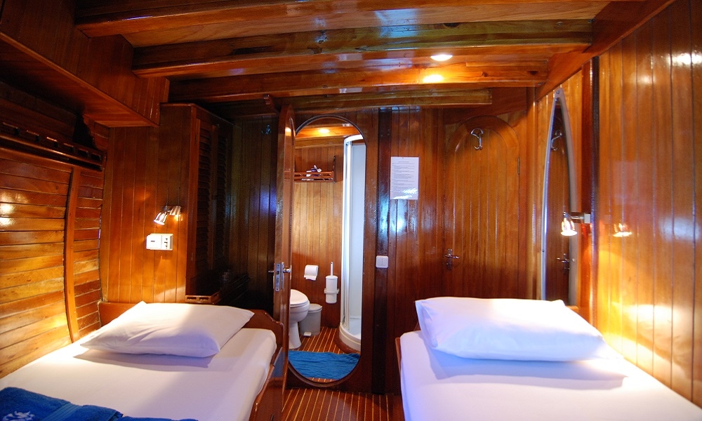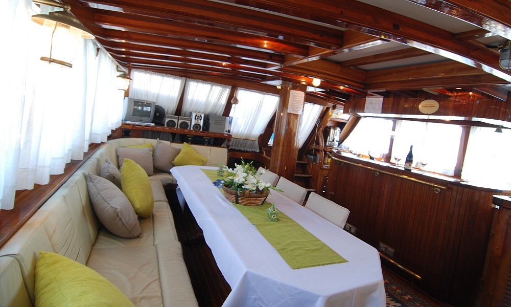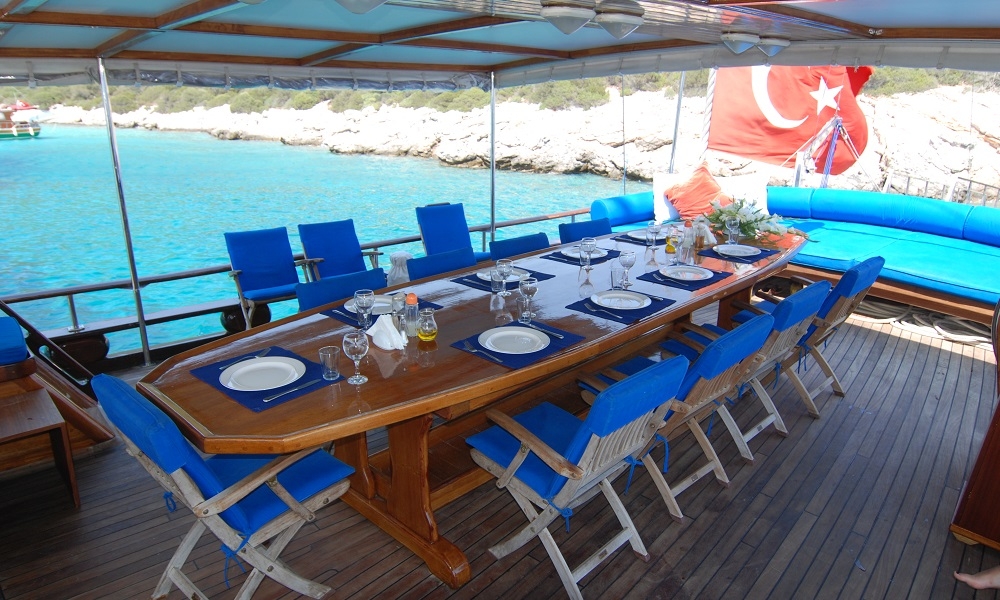 Unser 8-Kabinen-Gulet hat 6 Doppel- und 2 Zweibettkabinen, mit Klimaanlage, Toilette und Dusche in jeder Kabine, und bietet bequem Platz für insgesamt 16 Gäste. Das große und komfortable Wohnzimmer ist mit Geräten wie Fernseher, Satellitenfernsehen und CD-Player ausgestattet, um Ihre Zeit außerhalb des Meeres noch angenehmer zu gestalten. Während Sie die in unserer voll ausgestatteten Küche zubereiteten Mahlzeiten genießen, können Sie auch jeden Blauton entdecken.