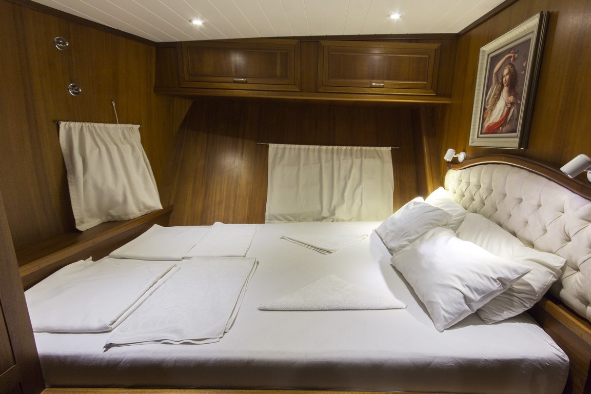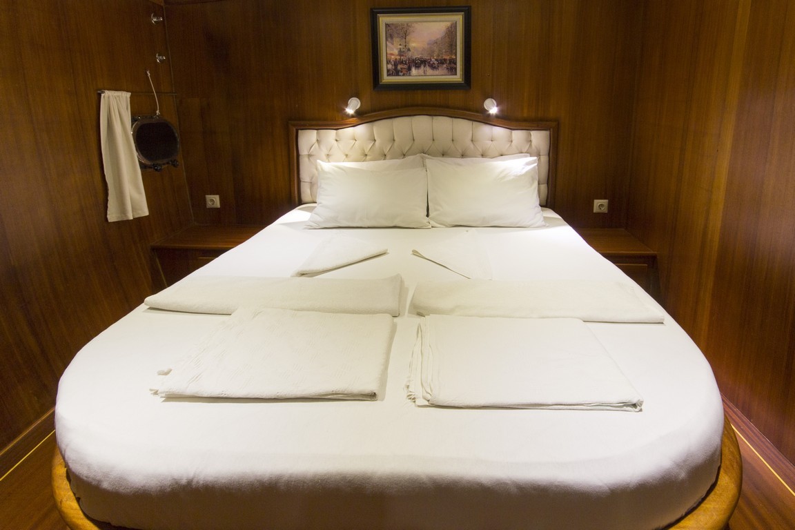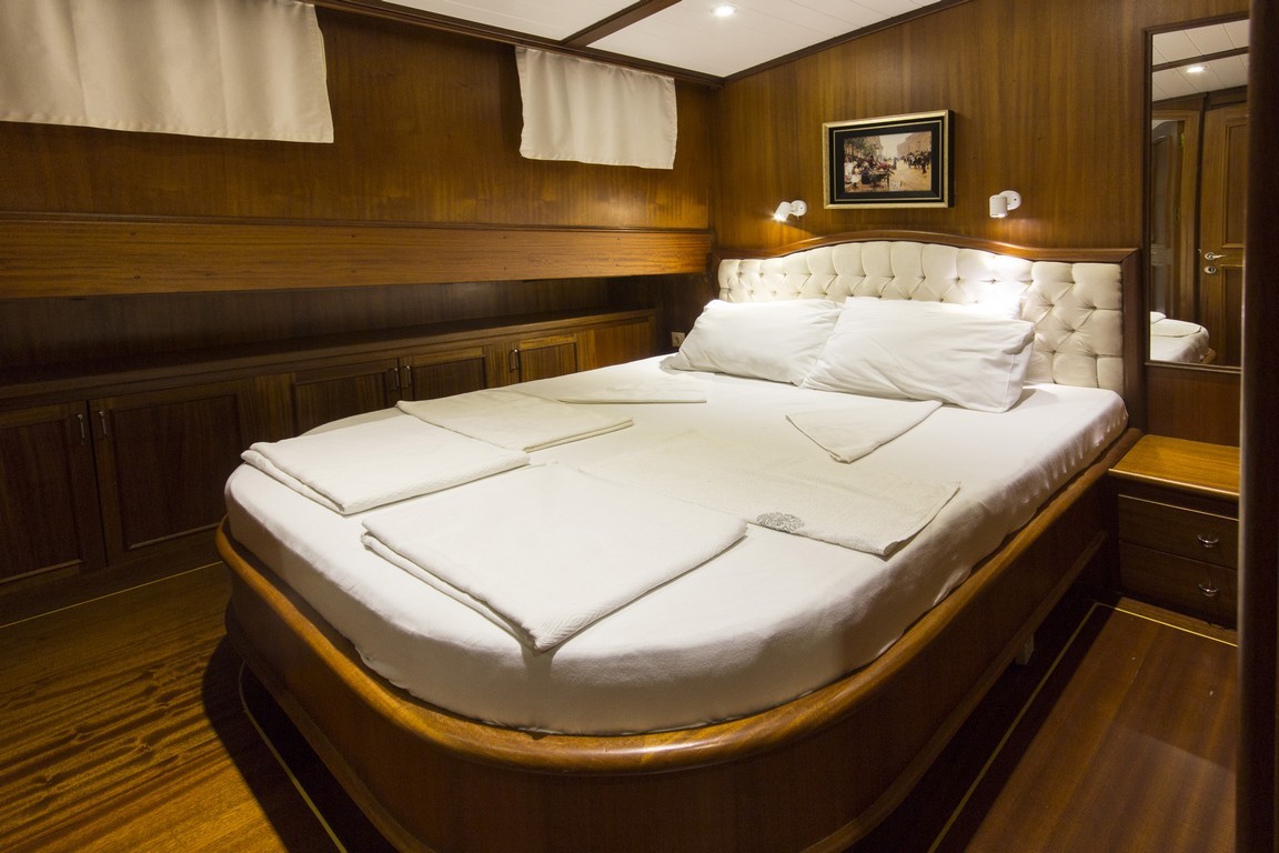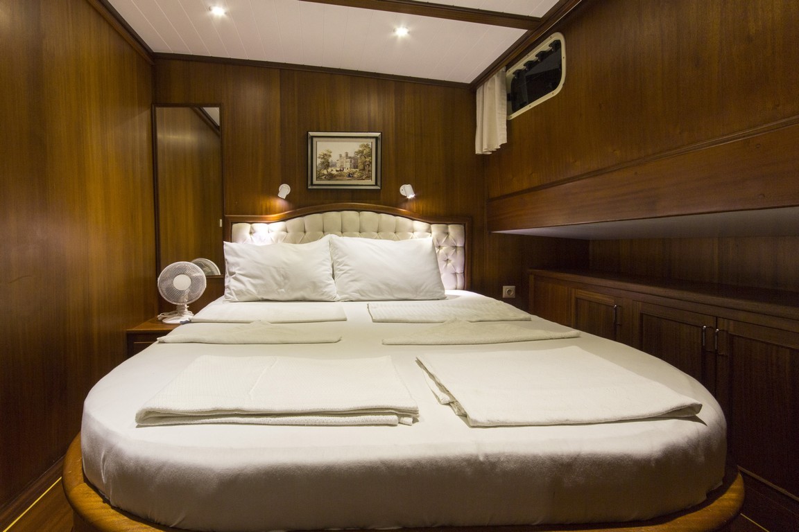 Unser Gulet mit 9 Kabinen hat 1 Master-, 6 Doppel- und 2 Zweibettkabinen, mit Klimaanlage, Toilette und Dusche in jeder Kabine, und bietet problemlos Platz für insgesamt 18 Gäste. Das große und komfortable Wohnzimmer ist mit Geräten wie Fernseher, Satellitenfernsehen und CD-Player ausgestattet, um Ihre Zeit außerhalb des Meeres noch angenehmer zu gestalten. Während Sie die in unserer voll ausgestatteten Küche zubereiteten Mahlzeiten genießen, können Sie auch jeden Blauton entdecken.