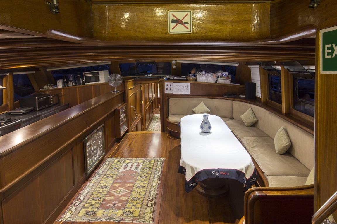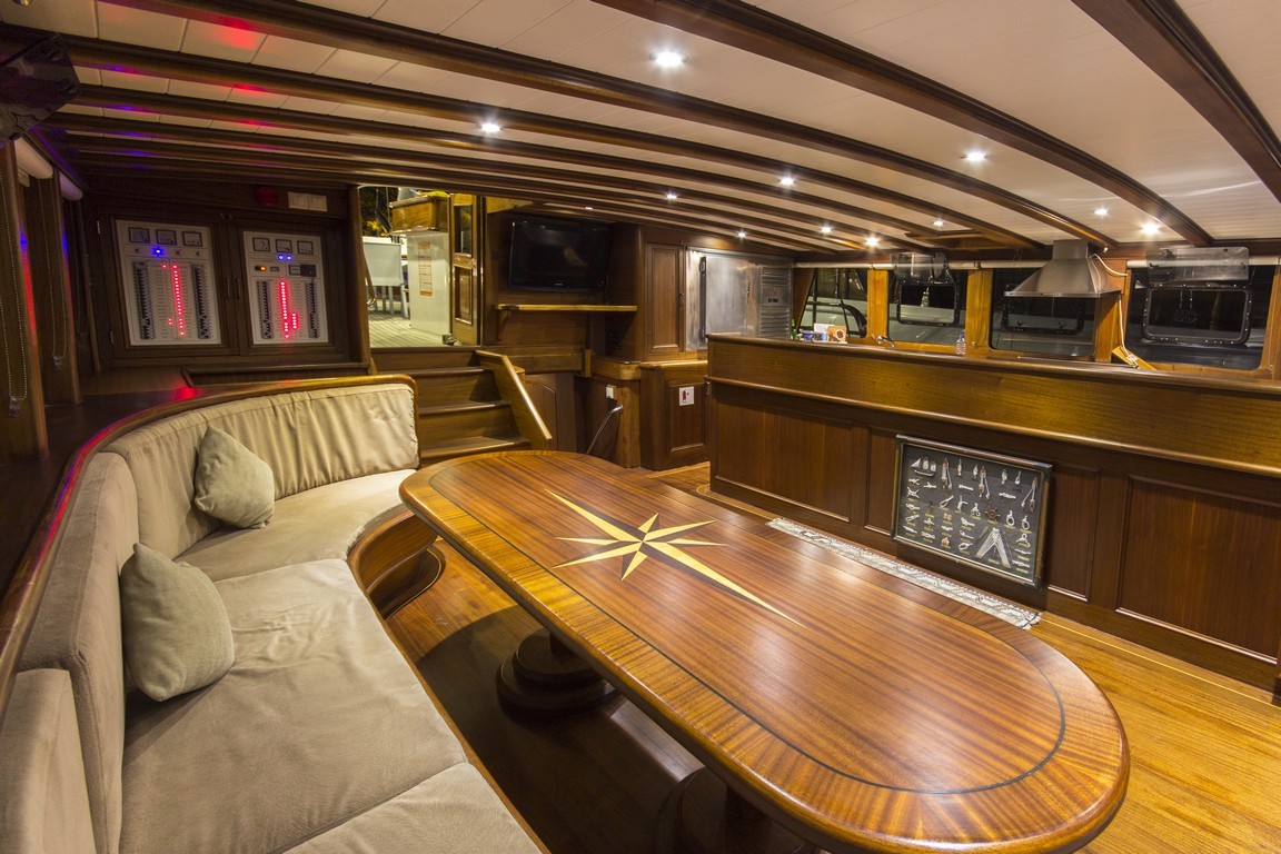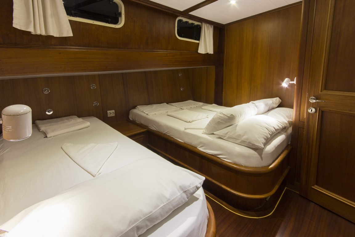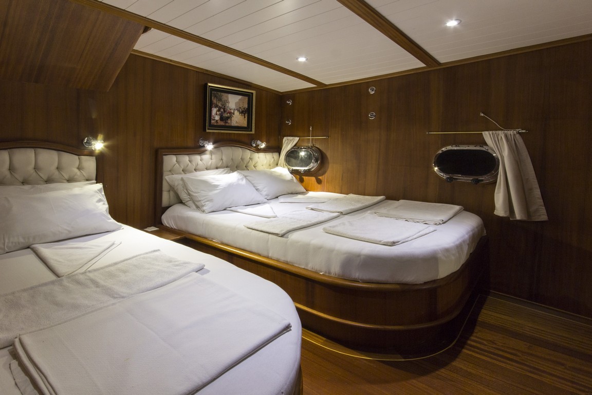 Unser Gulet mit 9 Kabinen hat 1 Master-, 6 Doppel- und 2 Zweibettkabinen, mit Klimaanlage, Toilette und Dusche in jeder Kabine, und bietet problemlos Platz für insgesamt 18 Gäste. Das große und komfortable Wohnzimmer ist mit Geräten wie Fernseher, Satellitenfernsehen und CD-Player ausgestattet, um Ihre Zeit außerhalb des Meeres noch angenehmer zu gestalten. Während Sie die in unserer voll ausgestatteten Küche zubereiteten Mahlzeiten genießen, können Sie auch jeden Blauton entdecken.