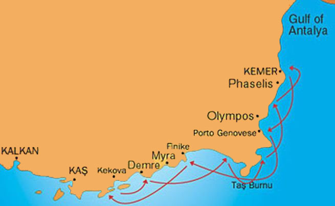 | ROUTE 15 Olympos - Fethiye | 3 Nächte / 4 Tage - Minikreuzfahrt | Abfahrt: | Dienstag | Mit A/C Gulet |