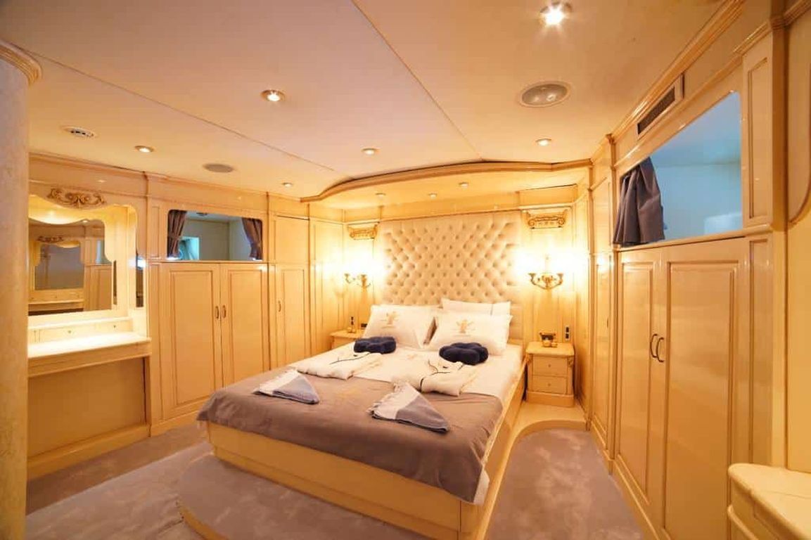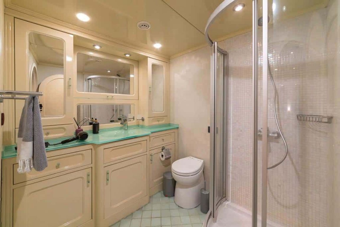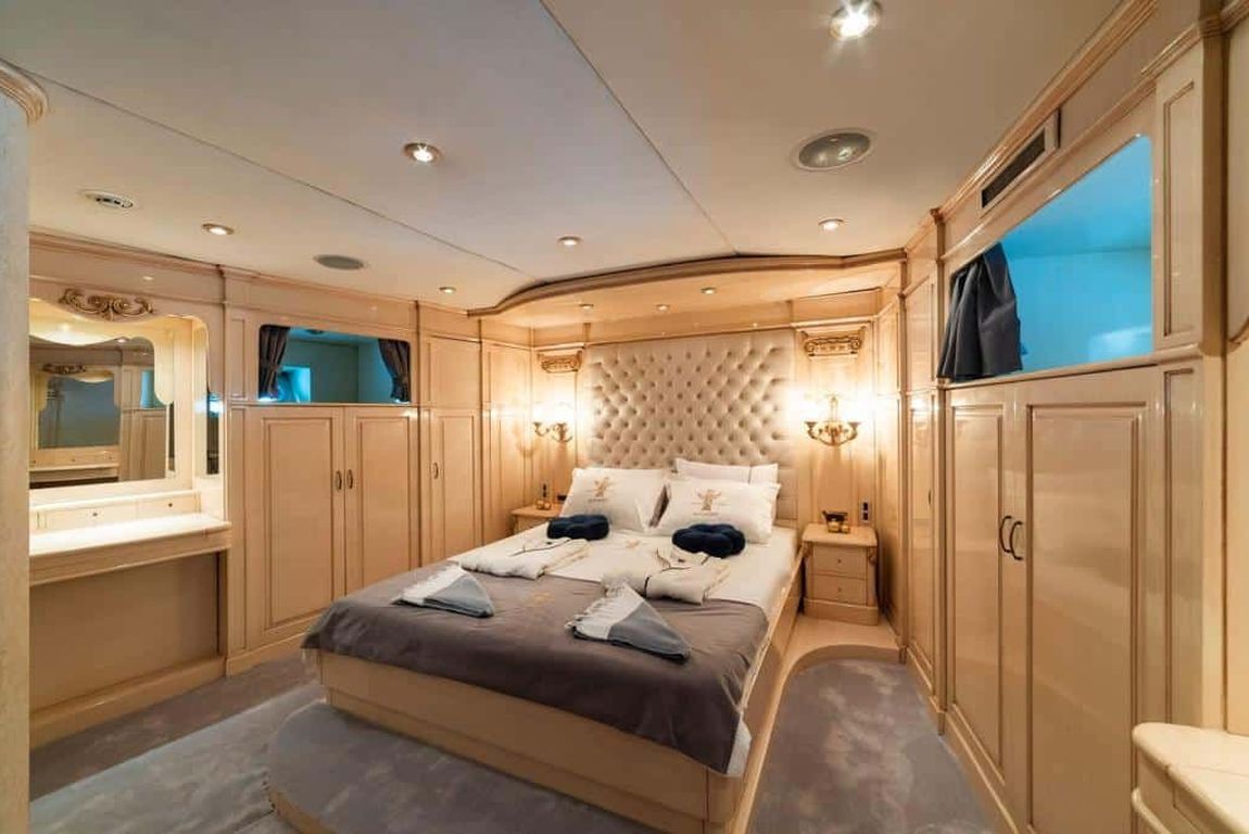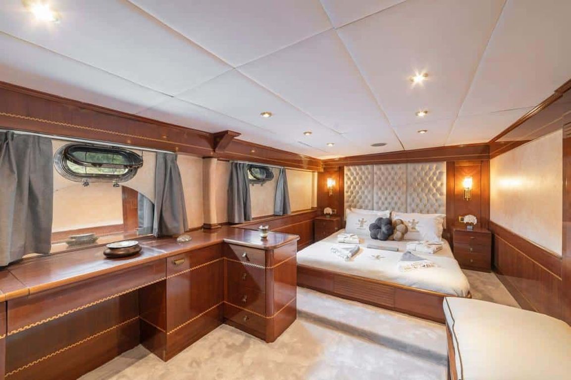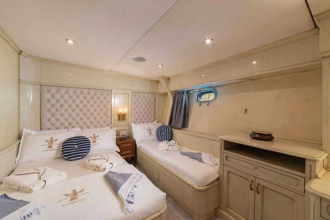 | Kapazität für bis zu 12 Gäste; 1 VIP-, 1 Master-, 1 Zweibett-, 2 Dreibettkabinen, Klimaanlage, Duschkabine und Heimtoiletten in allen Kabinen, separate Crew-Kabinen. |