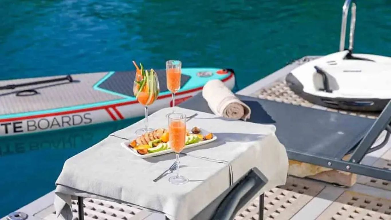 | 110 PS Außenbordmotor 6,20 Beiboot, Flybridge, Hydraulische Badeplattform, Sicherheitsausrüstung, Navigationsausrüstung, Ausgestattete Kombüse, Eismaschine, Deck mit Essbereich, Essbereich im Innenbereich, Deckdusche, Sonnenmatratzen, Whirlpool an Deck, Klimaanlage, Eismaschine, Wasseraufbereiter, Satellit, UKW-Radio, TV/DVD, WLAN-Internetverbindung, Kartenspiele, Backgammon, Schnorchel- und Angelausrüstung, Jetski, Seabob, Stand Up Paddle Board, Wasserski |