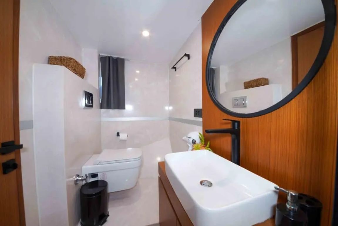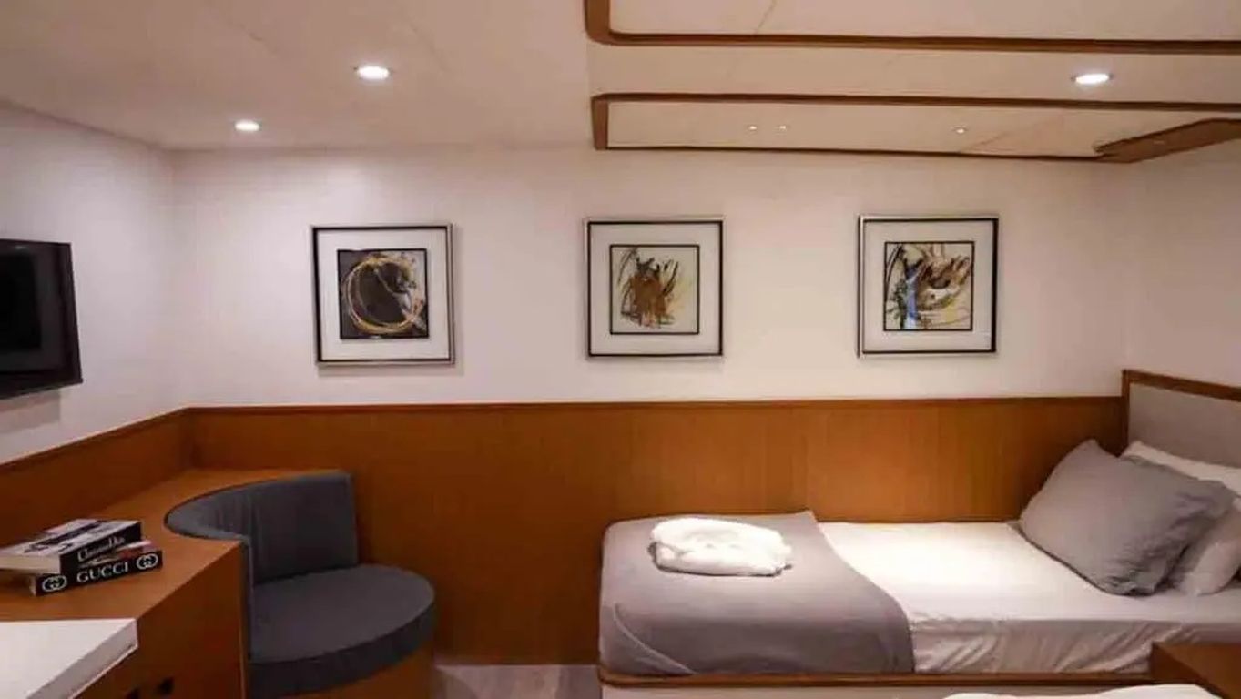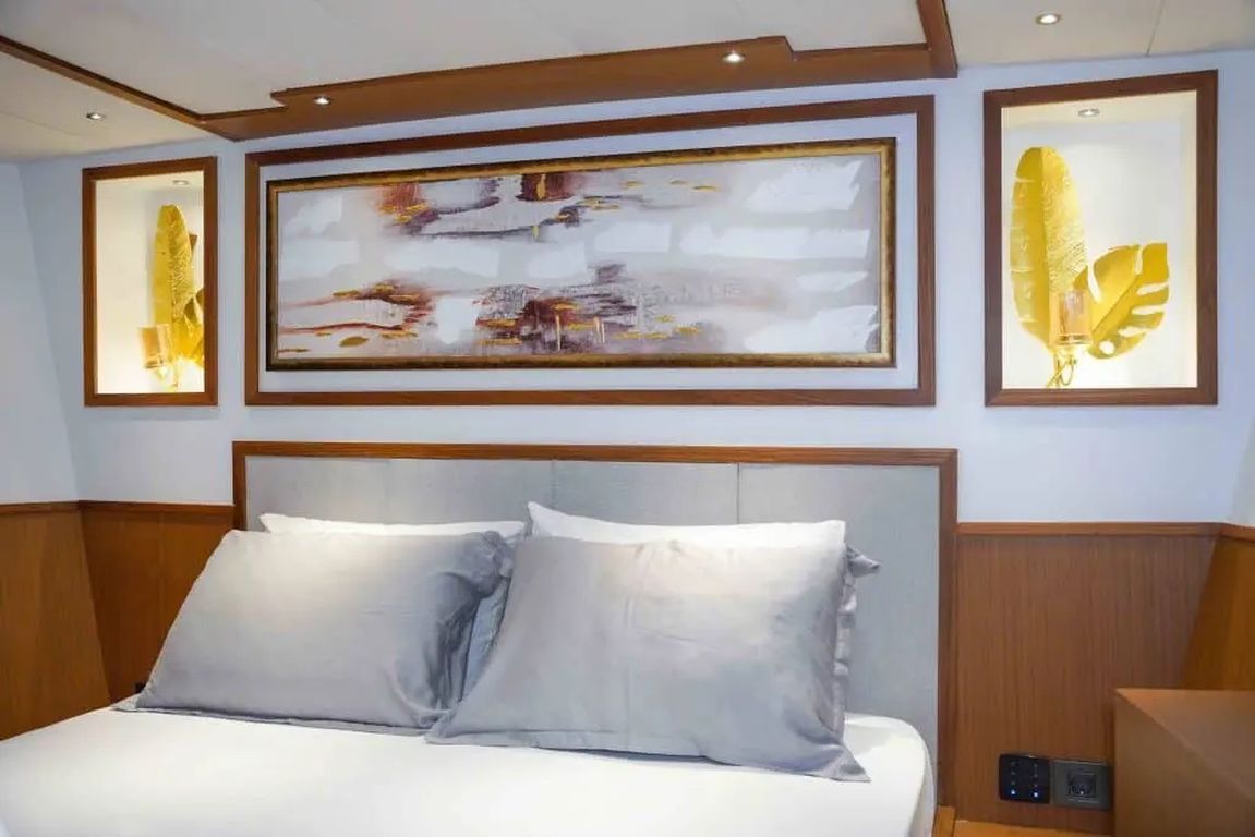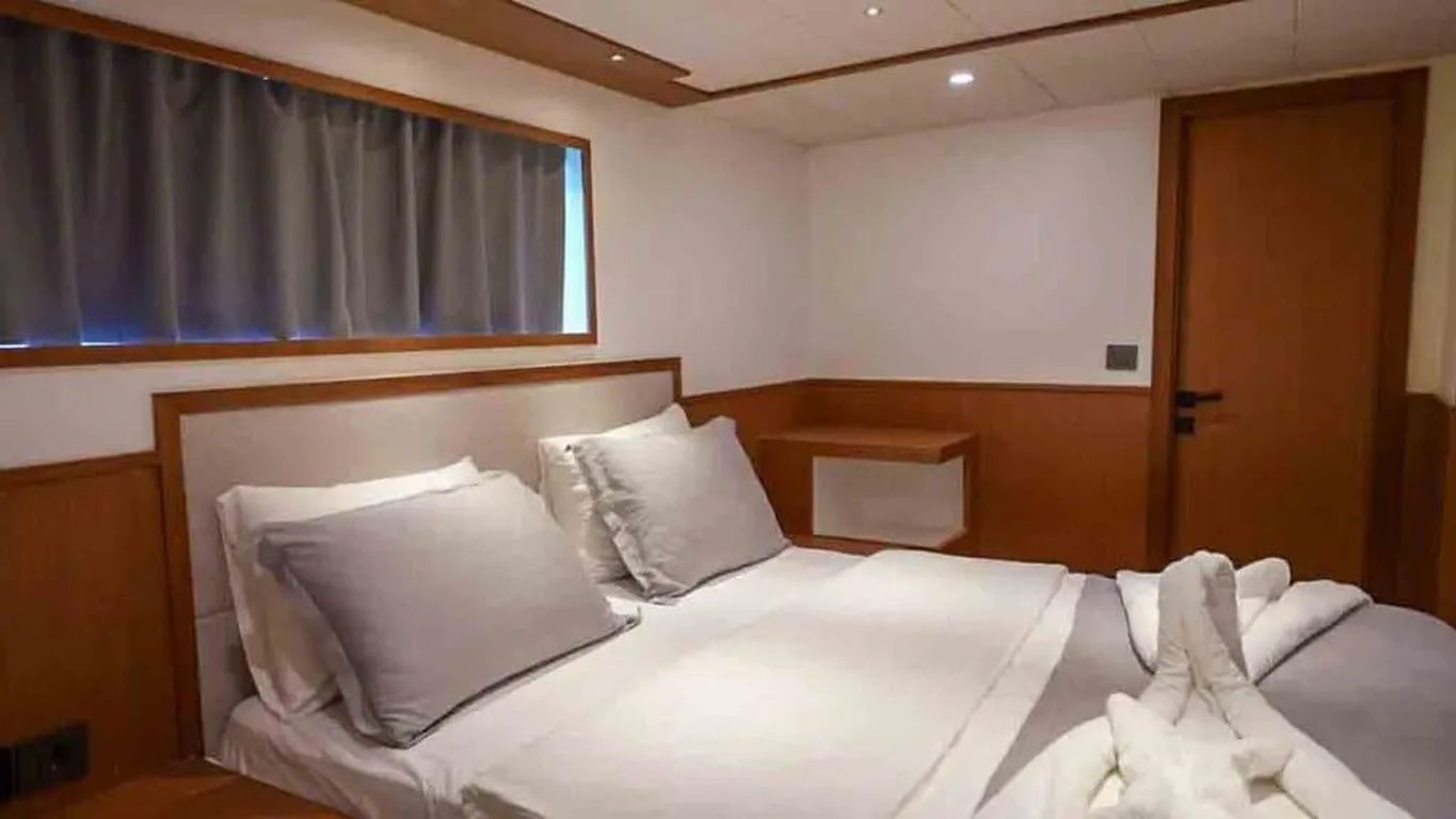 | Kapazität für bis zu 11 Gäste: 1 Master-, 3 VIP-Doppel-, 1 Dreibettkabine, Klimaanlage, Duschkabine und Haustoiletten in allen Kabinen, separate Crew-Kabinen. |