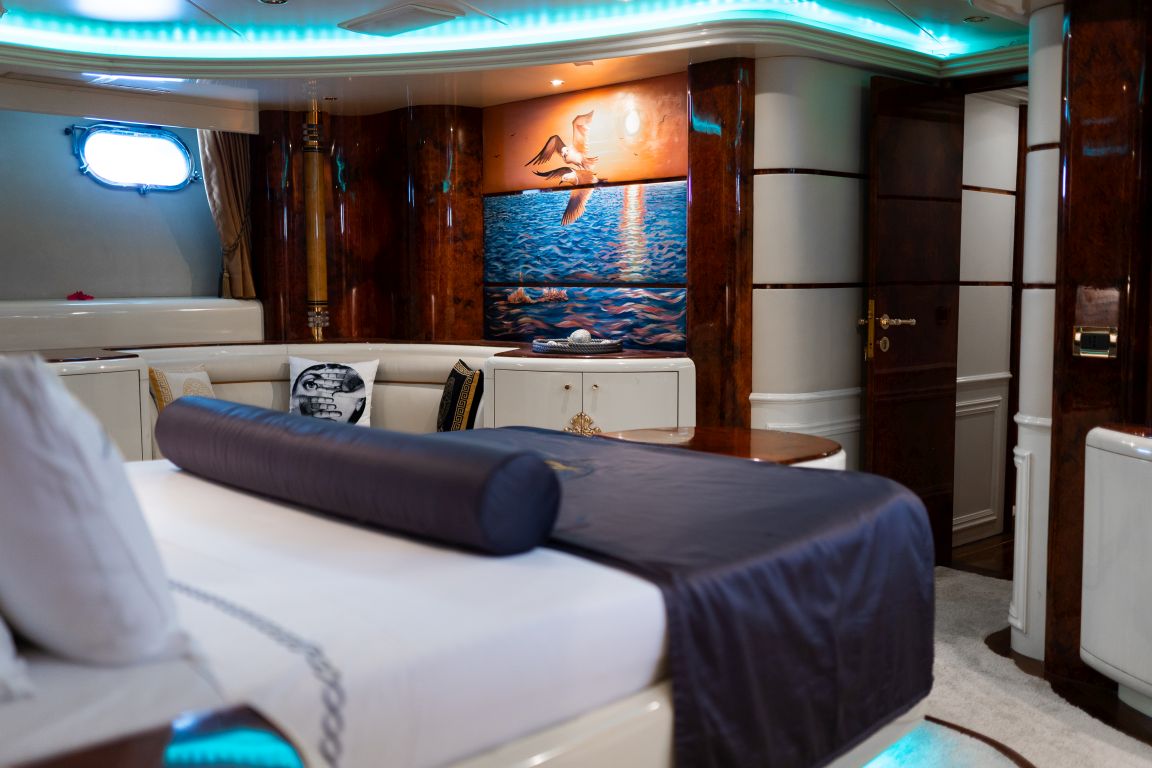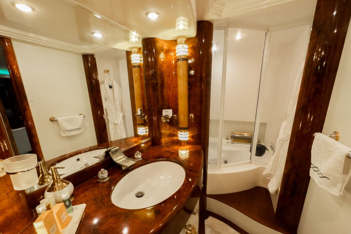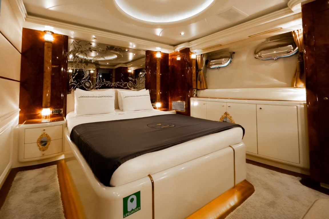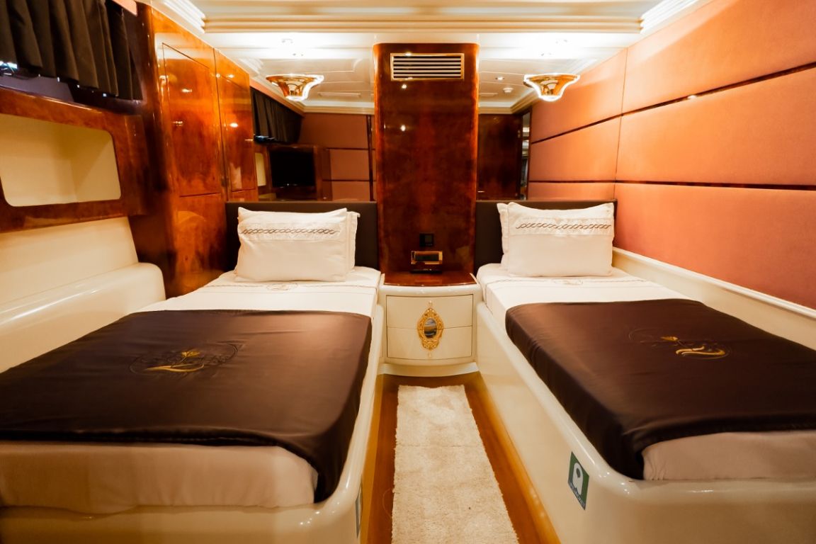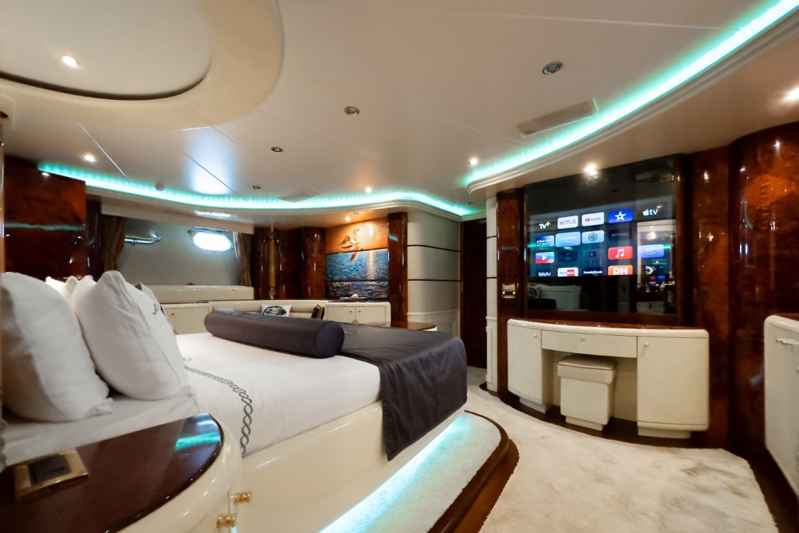 Bis zu 12 Gäste; 1 VIP-Kabine, 1 Master-Kabine, 3 Doppelkabinen, 1 Zweibettkabine. Master-Kabine: Die geräumige Master-Kabine befindet sich auf dem Unterdeck und verfügt über ein Kingsize-Bett, Apple TV, Internetzugang und WLAN, einen Schreibtisch/Schminktisch und ein Heimkino-Soundsystem. Zur Ausstattung gehören außerdem RGB-Ambientebeleuchtung, Klimaanlage, Whirlpool, WC und eine separate Duschkabine. VIP-Kabine: Die VIP-Kabine befindet sich auf dem Hauptdeck und bietet ein Kingsize-Bett, Apple TV, Internetzugang und WLAN, einen Schreibtisch/Schminktisch und ein Heimkino-Soundsystem. Gäste genießen hier RGB-Ambientebeleuchtung, Klimaanlage, Whirlpool, WC und eine private Duschkabine. Doppelkabinen (3): Drei komfortable Doppelkabinen befinden sich auf dem Unterdeck. Jede Kabine verfügt über ein Queensize-Bett, Apple TV, Internetzugang und WLAN, WC, Duschkabine oder Badewanne und Klimaanlage. Zweibettkabine: Die Zweibettkabine auf dem Unterdeck bietet zwei Einzelbetten, Apple TV, Internetzugang und WLAN, WC, Duschkabine und Klimaanlage. |