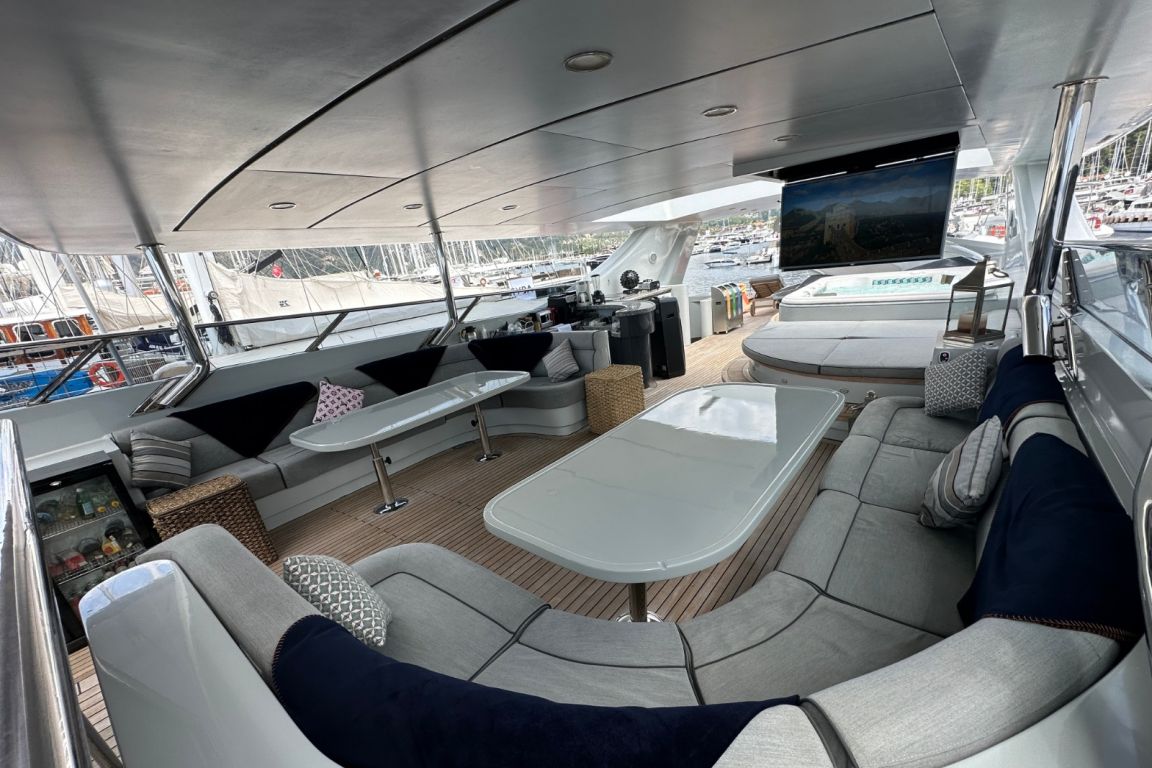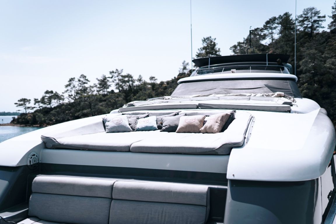 | BORDBEREICHE; Salon (Hauptdeck): Der elegante Hauptsalon bietet bequeme Ledersofas mit integrierter Kühlung, einen Esstisch, Klimaanlage und RGB-Ambientebeleuchtung. Zur Unterhaltung stehen Fernseher, Apple TV, Internetzugang, ein Heimkino-Soundsystem und zwei um 360° drehbare Fernseher zur Verfügung. Ein automatisches Vorhangsystem sorgt für maximalen Komfort und Privatsphäre. Flybridge: Die geräumige Flybridge bietet eine große Sonnenliegefläche, einen Grillplatz, Fernseher, Apple TV, Internetzugang und WLAN. Gäste können hier entspannen, den weiten Meerblick genießen, Musik über das Bord-Soundsystem hören und abends die RGB-Ambientebeleuchtung bewundern. BEHÄLTER & WASSERSPIELZEUG: Beiboot: Zodiac Medline 6.00 – 115 PS, Wasserski, Wakeboard, Ringo (Schlauchboot), Stand-Up-Paddle-Board, Angelausrüstung, Kanus, Bananenboot |